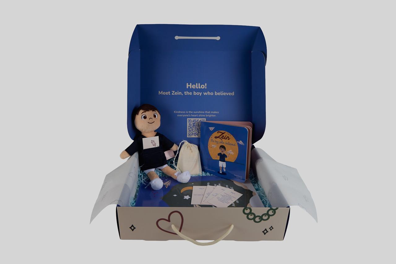 This box includes: – Zein the boy plushie – A heartwarming story book about kindness – Lunar Islamic calendar (Scratch to reveal) – 30 acts of kindness cards